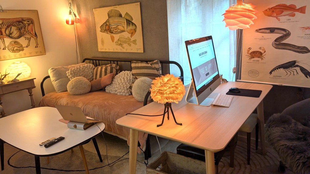 Walking into the office, the first thing that strikes me is the warmth of the setup. A soft couch piled with cushions invites moments of reflection, while the desk, lit by a feathered lamp, feels like a welcoming command center. I support organizations in navigating digital engagement and safety, and this environment inspires the patience, creativity, and focus that such work demands. The coziness of the space also makes breaks more restorative, offering comfort and calm that help me return to work with fresh energy.